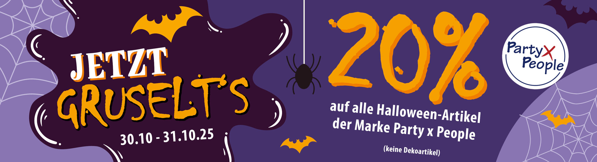 Vom 30.10.2025 - 31.10.2025 gibt es auf alle Halloween-Artikel der Marke Party x People 20%* Rabatt *(ausgenommen Dekoartikel)