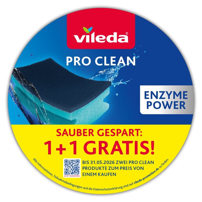 Entdecke VILEDA PRO CLEAN unsere neue Produktreihe mit Tüchern und Topfreinigern, die auf natürliche Weise länger hygienisch bleiben. Die PRO CLEAN-Produkte sind mit nützlichen Mikroorganismen (Probiotika) behandelt, die bei Kontakt mit Feuchtigkeit und Schmutz natürliche Enzyme produzieren. Diese Enzyme zersetzen Fett und Schmutz in mikroskopisch kleine Partikel, was das Ausspülen des Produkts erleichtert und schlechte Gerüche sowie Schmutzablagerungen reduziert. Einmal aktiviert, bleiben die Enzyme im Produkt und halten es bis zu doppelt so lange sauber und hygienisch.*