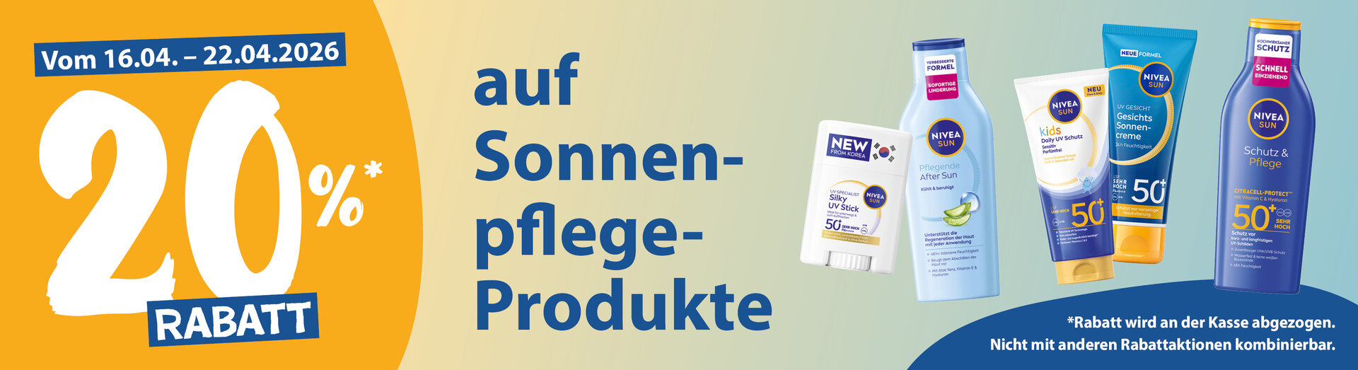 Vom 16. April bis 22. April 2026 erhalten Sie 20 % Rabatt* auf Sonnenpflegeprodukte.